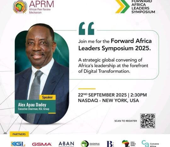 The Executive Chairman of the KGL Group and former Board Chair of the Ghana Investment Promotion Centre (GIPC), Mr. Alex Apau Dadey, delivered a resounding opening address at the Forward Africa Leaders Symposium 2025, held in partnership with the Africa Peer Review Mechanism at the iconic home of global enterprise — NASDAQ, New York.