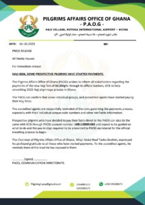 In a statement issued by its Communications Directorate, PAOG emphasized that individual pilgrims who wish to make direct payments may do so through the office’s official account with GCB Bank (Account Number: 1681130001682). Such pilgrims are required to present their pay-in slips at the PAOG Secretariat to begin the official travel documentation process.