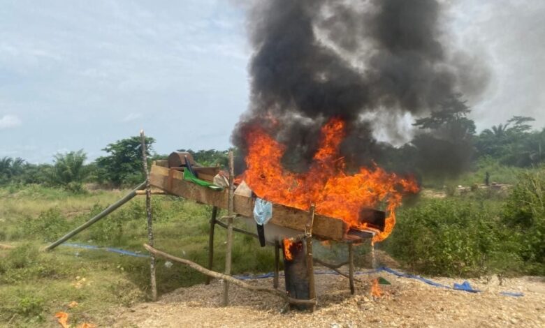 Two excavators found on site were immobilised, while a metallic gold washing platform, makeshift shelters, water pumps, hoses, and a locally fabricated mineral processing system were dismantled and destroyed.