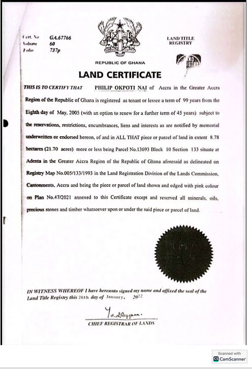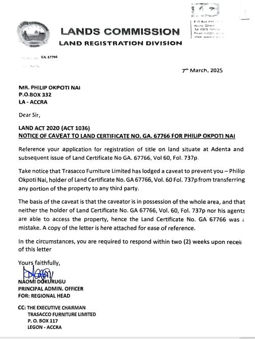 According to documents sighted, Mr. Philip Okpoti Nai, the rightful holder of Land Certificate No. GA 67766, Vol. 60, Fol. 737p was issued a notice by the Lands Commission indicating that a caveat had been lodged against his property.